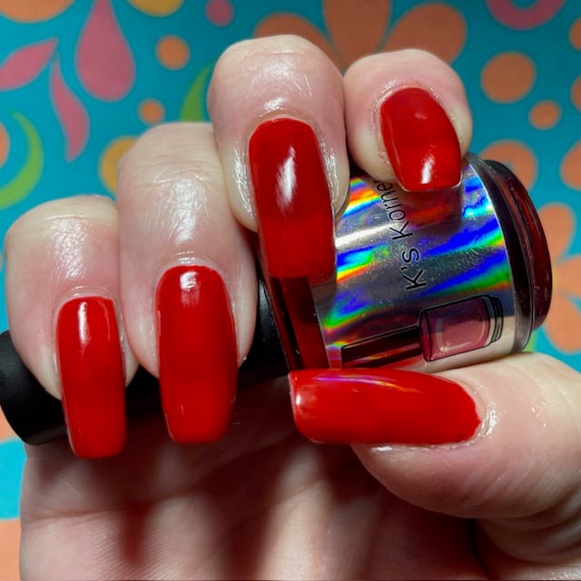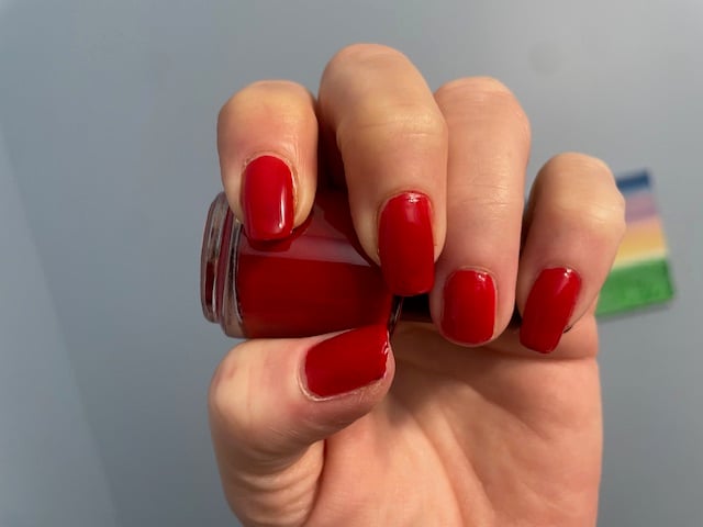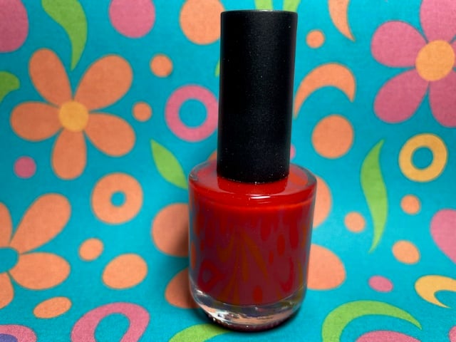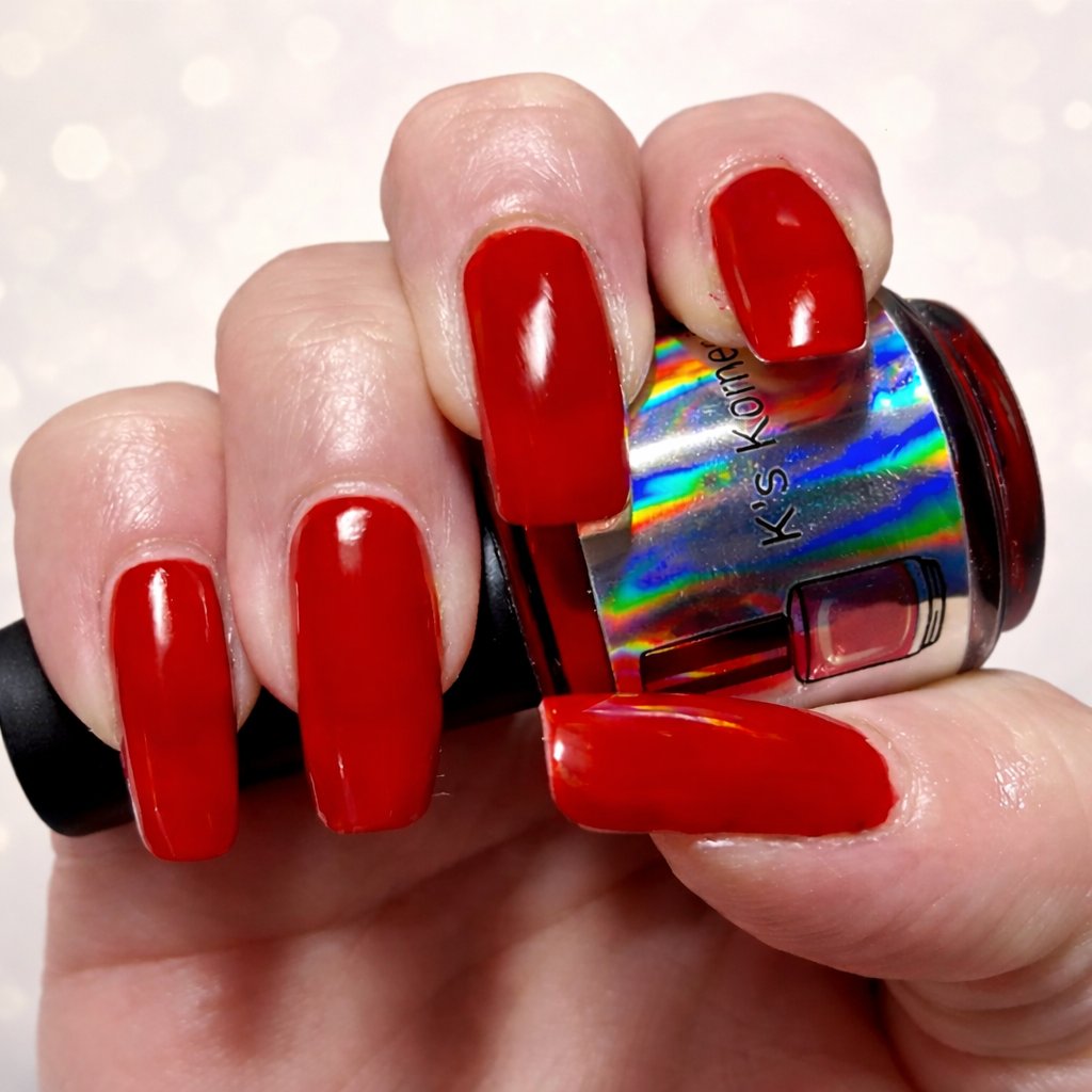 A cream polish, Red in color, that provides full coverage in two to three coats, depending on nail length and application. This is the perfect red polish.