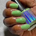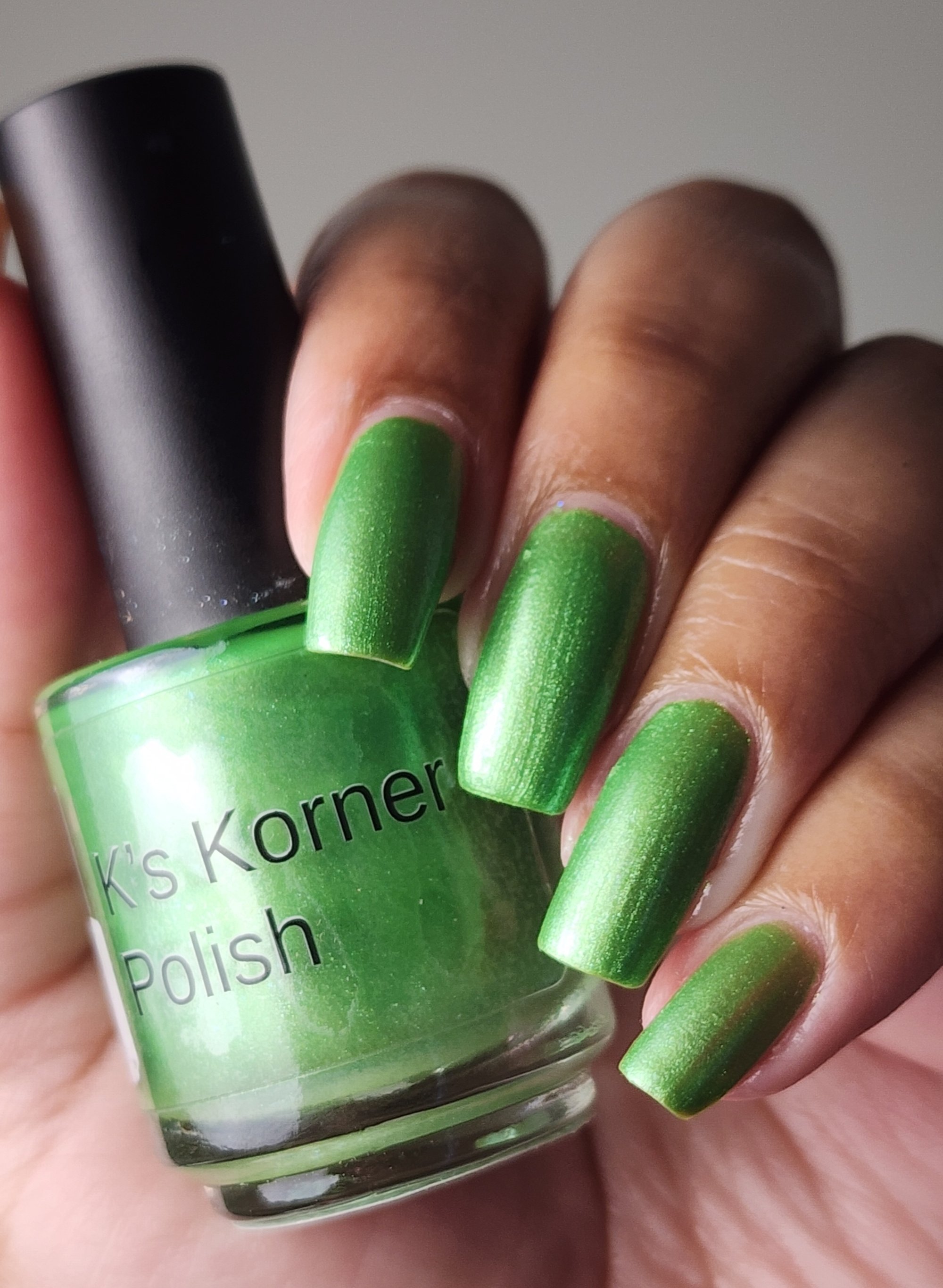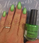 It is a festive shade of green that evokes memories of childhood holidays with its shimmering green and sparks. It applies easily and offers complete coverage in just two coats. This is a 0.5 oz bottle.