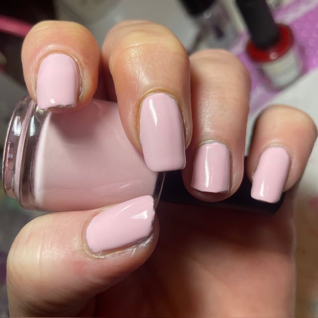 A pink polish that is opaque in 2 coats, depending on application. In person, this pink is distinctive and soft. The pictures don't do it justice,